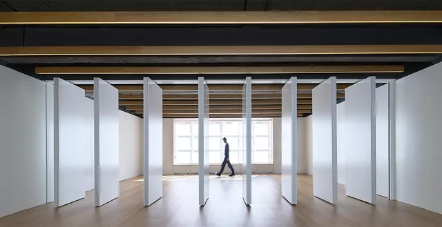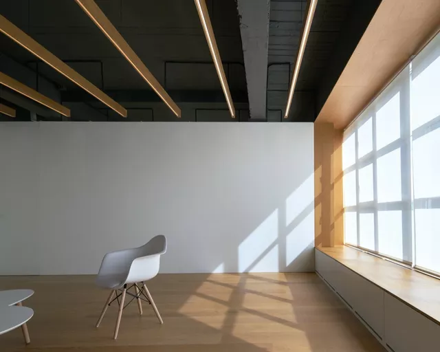 In contrast to this spatial austerity, a careful selection of natural materials combined with the custom design of several furniture elements, such as linear oak lamps, provide warmth and human scale. This comprehensive approach to architecture strives to achieve a functional, efficient design of the space while enhancing the wellbeing of its users.