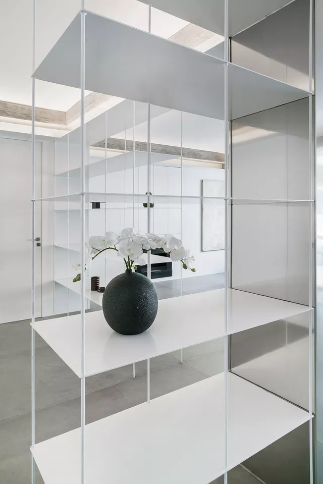 The texture of the mass concrete of the original structure is balanced by the use of sophisticated, light, polished elements in burnished stainless steel sheet. These light elements cover the columns to make them disappear and achieve carefully considered ambient lighting of the space using fine suspended strips in the same material. The careful design of light, delicate lacquered steel shelving, acting as a small filter at the entrance, completes the intervention.