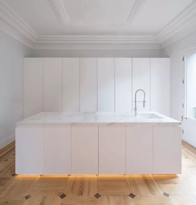 The project entails the challenge of adapting two classic Art Deco turn-of-the-century homes (originally a single dwelling) to the needs of the contemporary home, allowing them to be sold after the renovation either as two independent units or one large luxury residence, without the need for additional work.