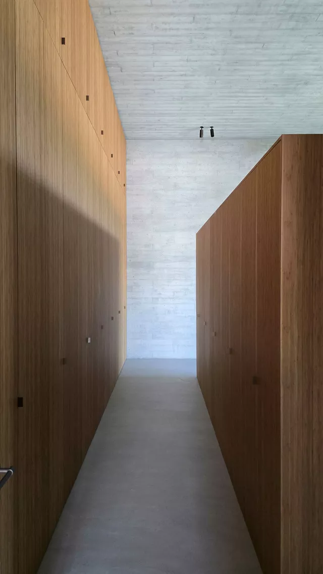 The material and spatial organisation of the home aims to maximise its passive behaviour, starting from the ventilated central space that guarantees thermal stability, thereby reducing the energy demand of the adjoining rooms. The structural system of concrete screens and the double-leaf, ventilated ceramic façade with 12 cm of insulation guarantee a healthy balance between insulation and internal thermal inertia. The necessary wooden sunscreens constitute a more dynamic element. Taken together, they ensure thermal stability throughout the year with minimal energy consumption.