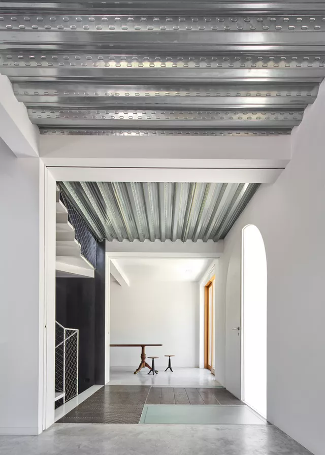 To this end, the entire interior of the house is emptied, including structure and roof, and a new and unique central concrete infrastructural core is designed to organize the program on all floors, optimizing both natural light and ventilation and reducing communication spaces. The light staircase inside and the double height spaces around it, enhance the spatial quality of the house ensuring the visual relationship between different floors.