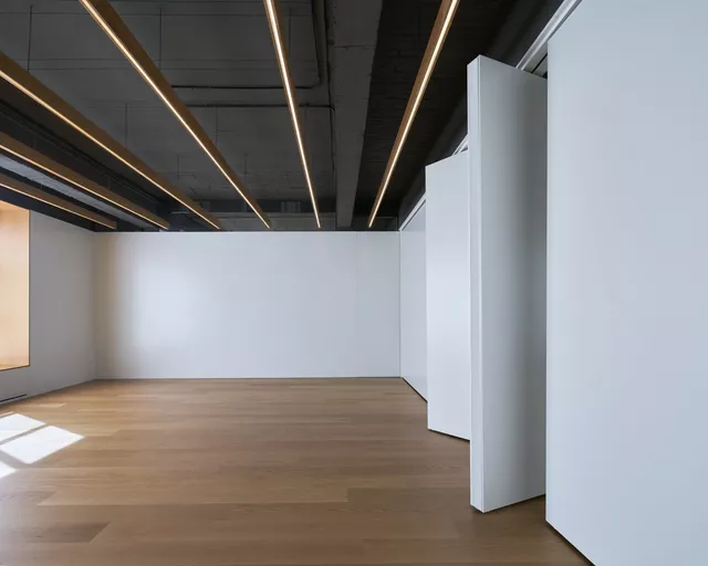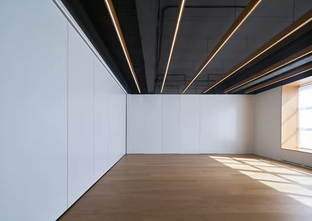 In contrast to this spatial austerity, a careful selection of natural materials combined with the custom design of several furniture elements, such as linear oak lamps, provide warmth and human scale. This comprehensive approach to architecture strives to achieve a functional, efficient design of the space while enhancing the wellbeing of its users.
