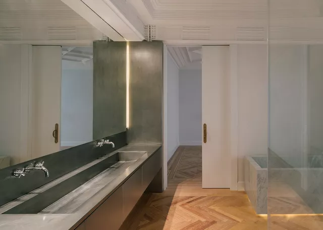 The project entails the challenge of adapting two classic Art Deco turn-of-the-century homes (originally a single dwelling) to the needs of the contemporary home, allowing them to be sold after the renovation either as two independent units or one large luxury residence, without the need for additional work.