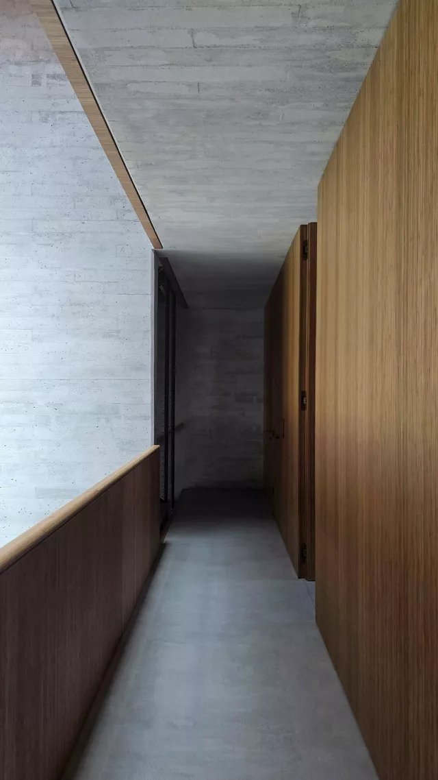 The material and spatial organisation of the home aims to maximise its passive behaviour, starting from the ventilated central space that guarantees thermal stability, thereby reducing the energy demand of the adjoining rooms. The structural system of concrete screens and the double-leaf, ventilated ceramic façade with 12 cm of insulation guarantee a healthy balance between insulation and internal thermal inertia. The necessary wooden sunscreens constitute a more dynamic element. Taken together, they ensure thermal stability throughout the year with minimal energy consumption.