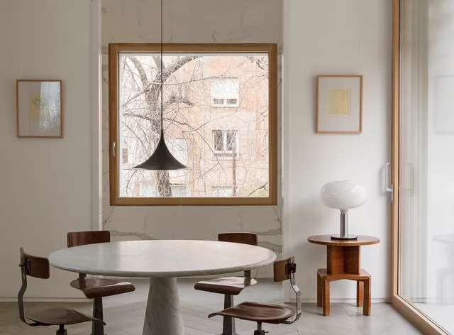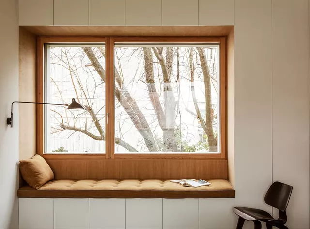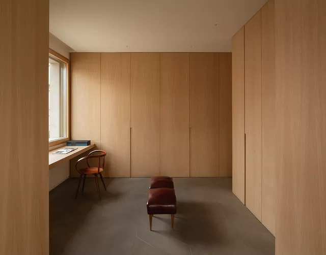 Inclusion of geothermal energy and the implementation of numerous passive strategies in the very structure of the home to make use of natural ventilation and the thermal inertia of the materials themselves contribute to moderating the temperatures in the interior space and optimising the house’s energy performance throughout the year. The interior spaces are covered with some freedom in materials with smooth finishes, with expansive wood-trimmed windows, framing views and creating a variety of domestic nooks that incorporate pieces of furniture contributing the necessary warmth to the domestic layout as a counterpoint to the bare, clean spatial nature of the design.